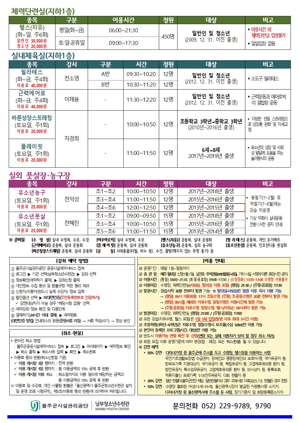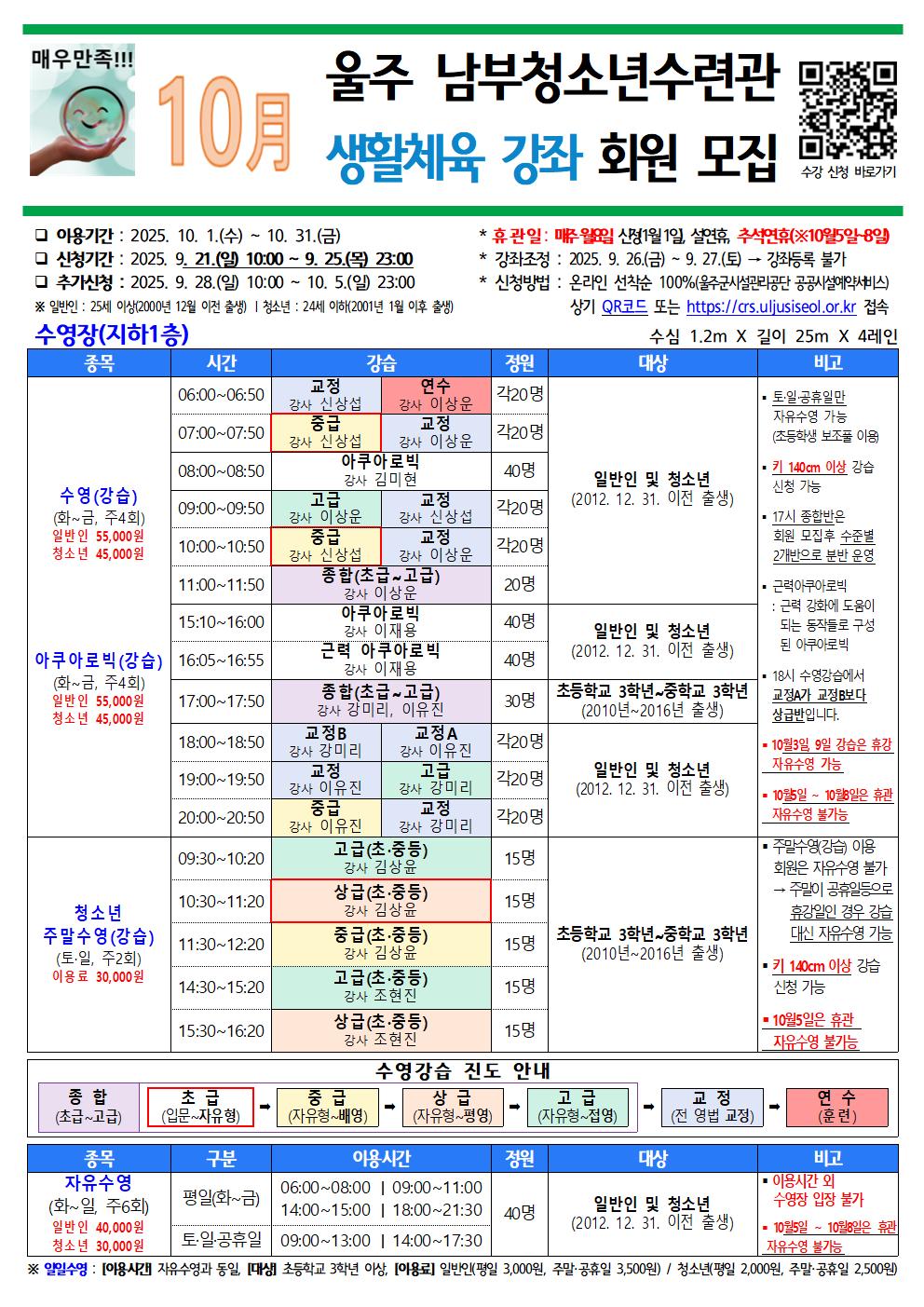 [울주남부청소년수련관 2025년 10월 생활체육 강좌 회원 모집]