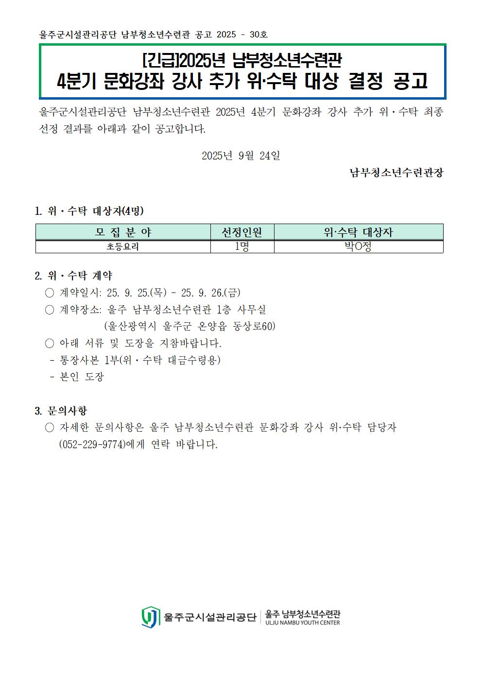 [공지] [긴급][남부청소년수련관] 2025년 4분기 아동,청소년 문화강좌 강사 추가 위,수탁 대상 결정 공고