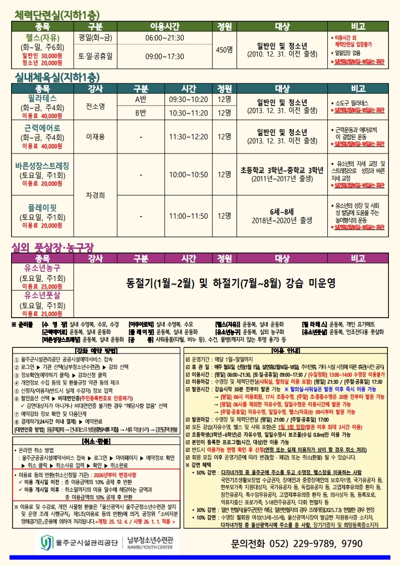 [울주남부청소년수련관 2026년 2월 생활체육 강좌 회원 모집]