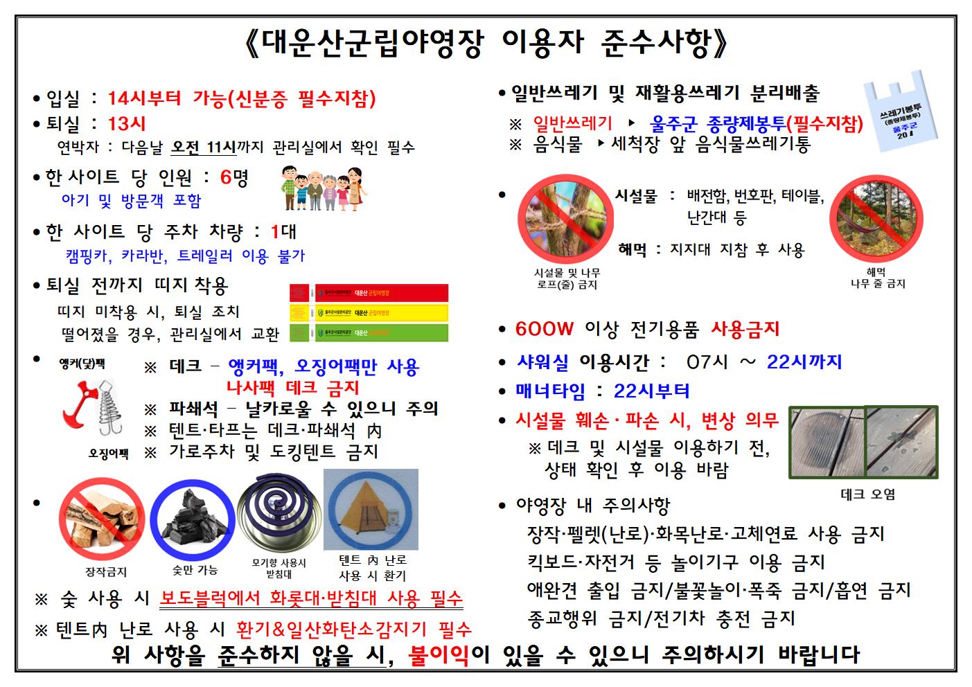 대운산군립야영장 정식 개장에 앞서 시범운영을 실시하오니 많은 관심과 참여 바랍니다.