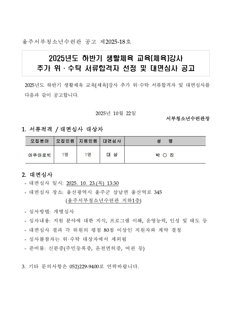 [서부청소년수련관]2025년 하반기 생활체육 교육[체육]강사 추가 위수탁 서류합격자 선정 및 대면심사 공고