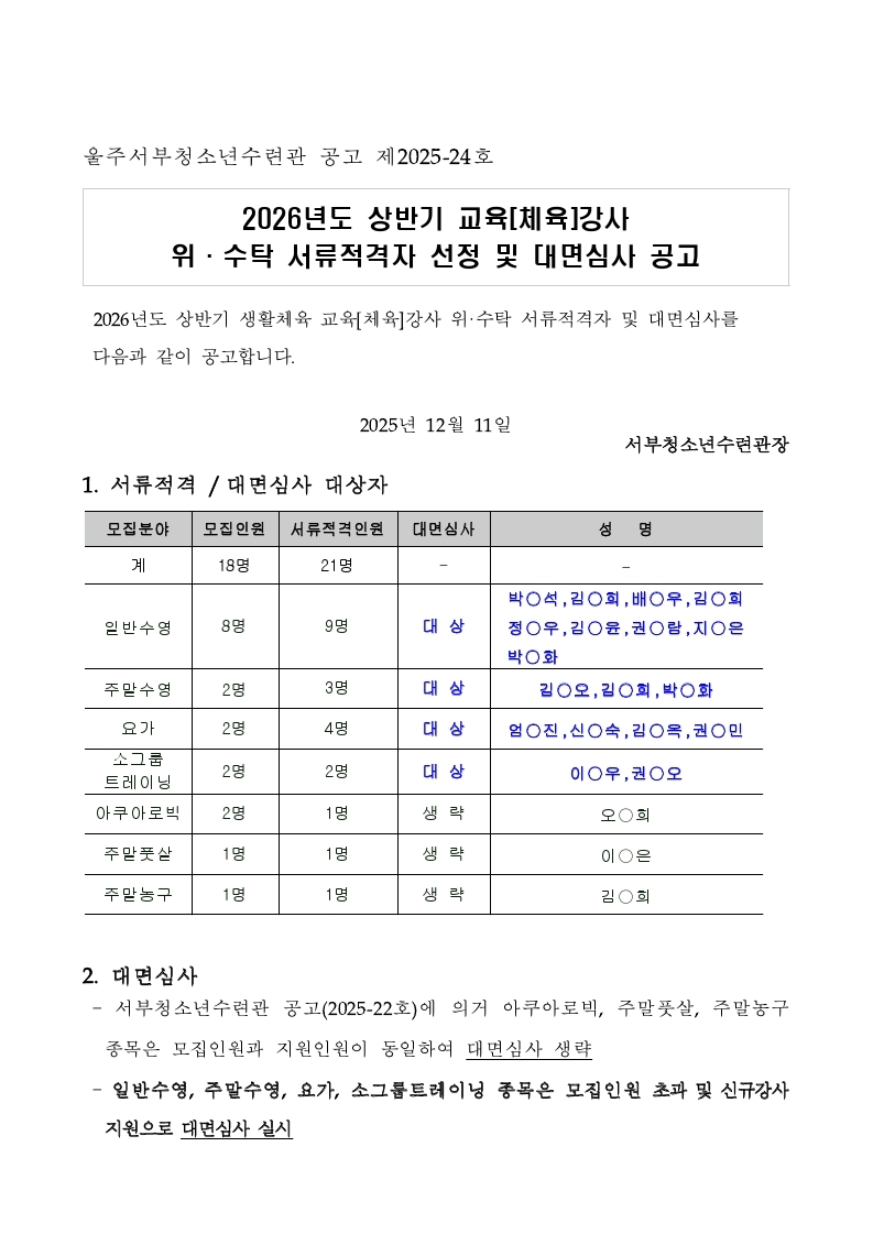 [서부청소년수련관]2026년 상반기 생활체육 교육[체육]강사 위수탁 서류적격자 선정 및 대면심사 공고