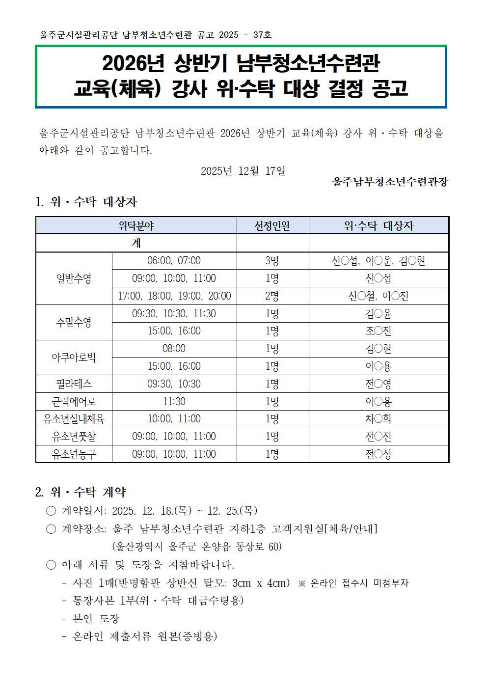 [남부청소년수련관] 2026년 상반기 교육(체육) 강사 위·수탁 대상 결정 공고