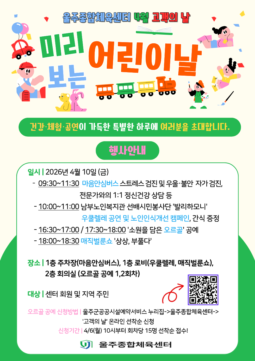 울주종합체육센터 정정화 관장은 “고객의 날을 맞아 단순한 운동 시설의 의미를 넘어 지역 주민들이 소통하고 즐길 수 있는 축제의 장을 마련했다”며, “정신건강 검진부터 문화 공연까지 내실 있게 준비한 만큼 많은 분들이 오셔서 봄날의 활기를 만끽하시길 바란다”고 전했다.