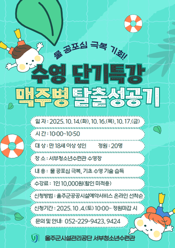 [공지] [울주서부청소년수련관] 생활체육 수영 단기특강 "맥주병 탈출성공기" 회원모집