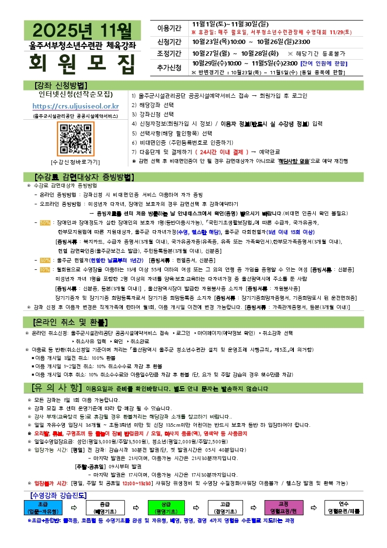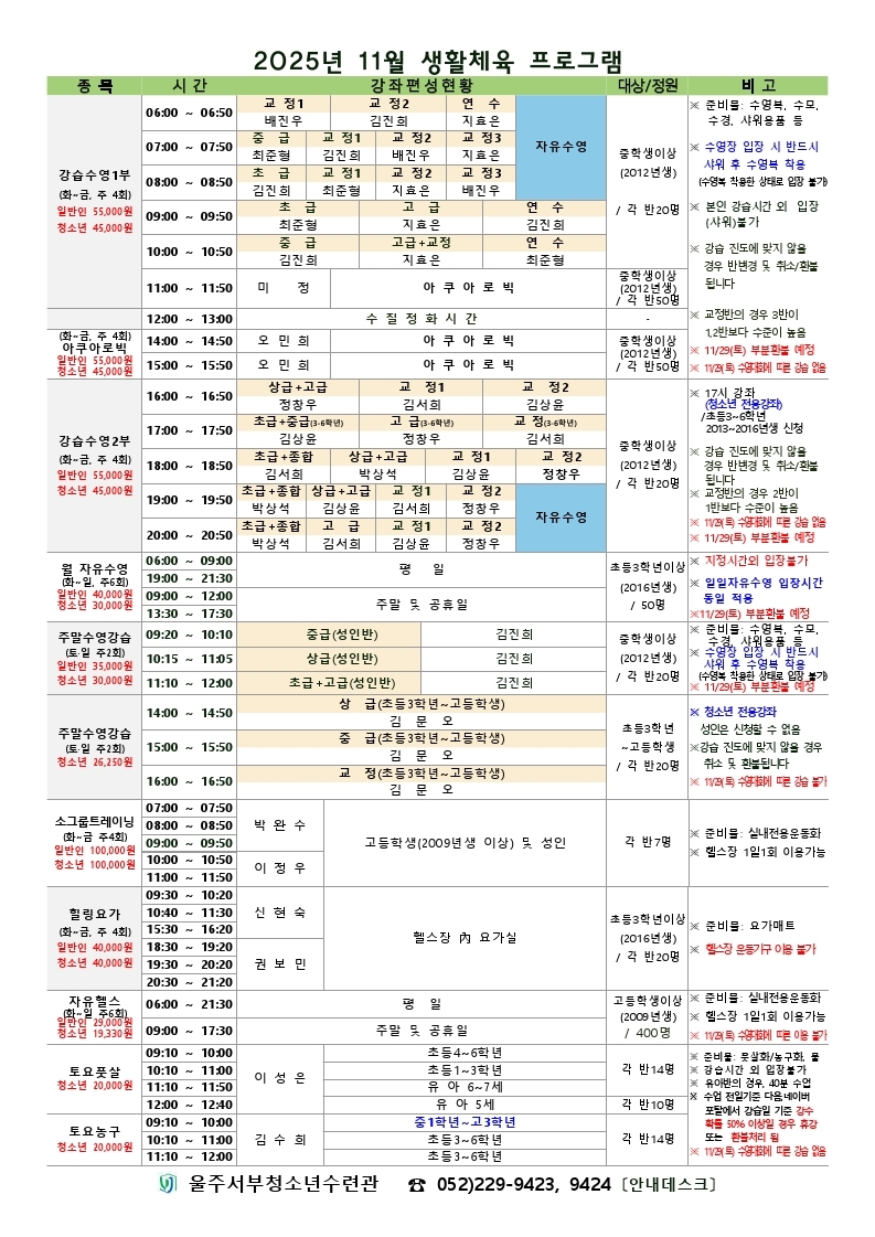 [공지] [울주서부청소년수련관] 2025년 11월 생활체육 프로그램 이용안내
