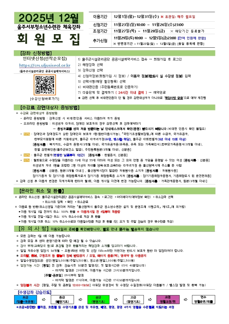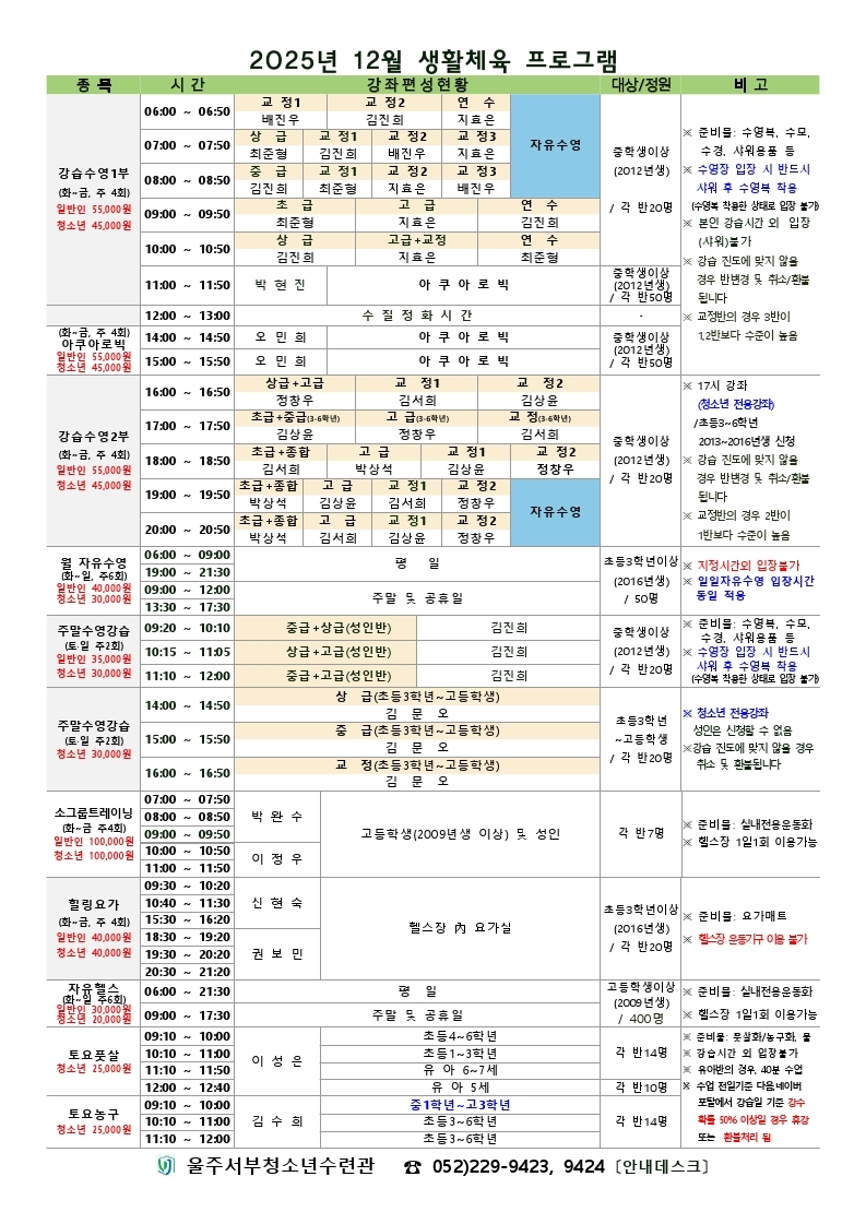 [공지] [울주서부청소년수련관] 2025년 12월 생활체육 프로그램 이용안내