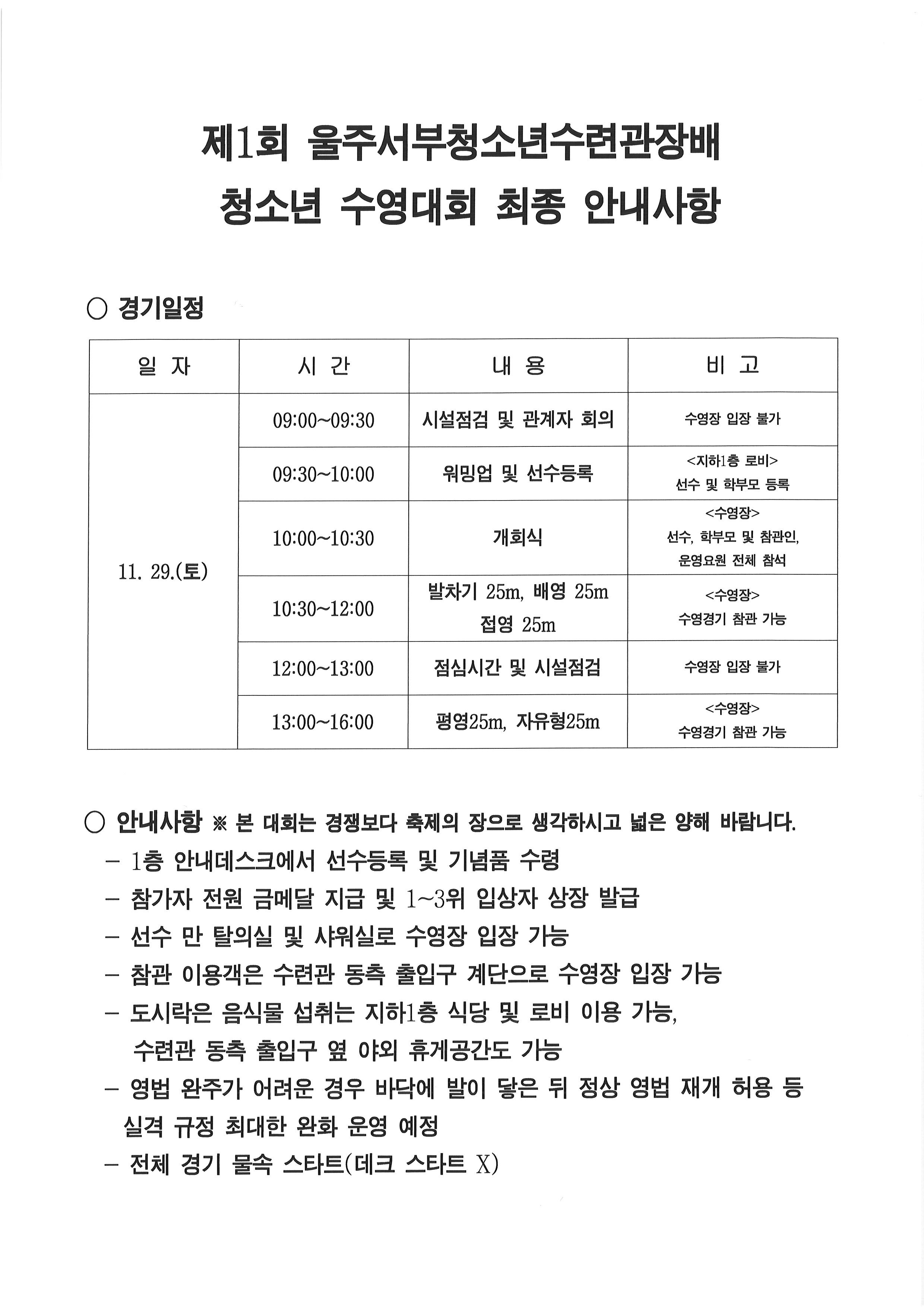 [공지] 제1회 서부청소년수련관장배 청소년 수영대회 최종 안내사항 공지