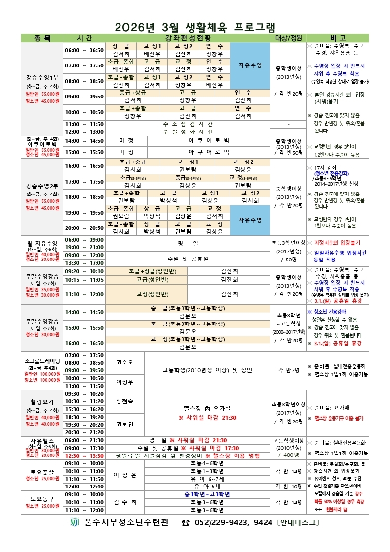 [생활체육] [울주서부청소년수련관] 2026년 3월 생활체육 프로그램 이용안내