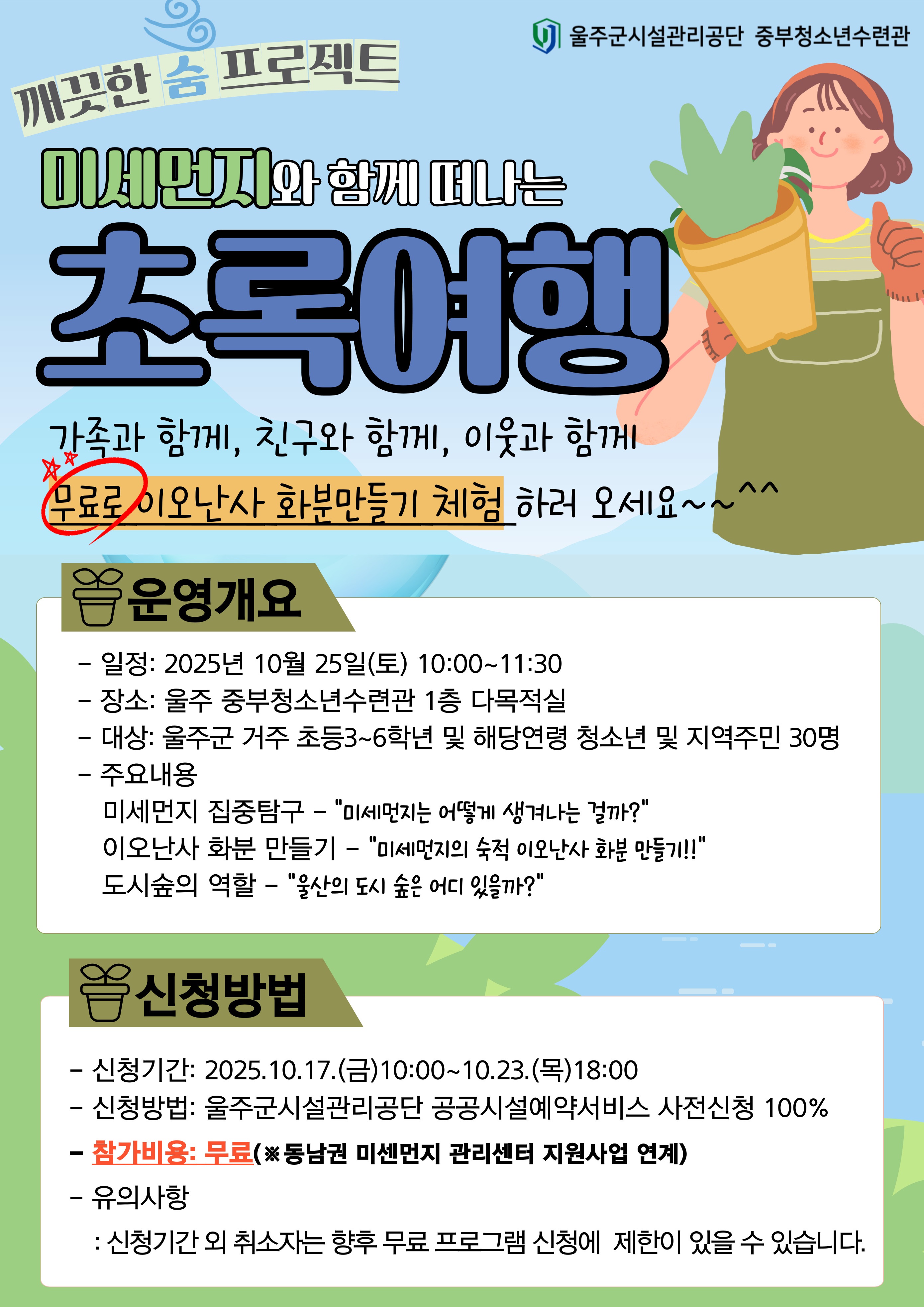 - 대상 : 울주군 거주 초등3~6학년 및 해당연령 청소년 및 지역주민 30명(부모님만 신청하셔도 됩니다~)