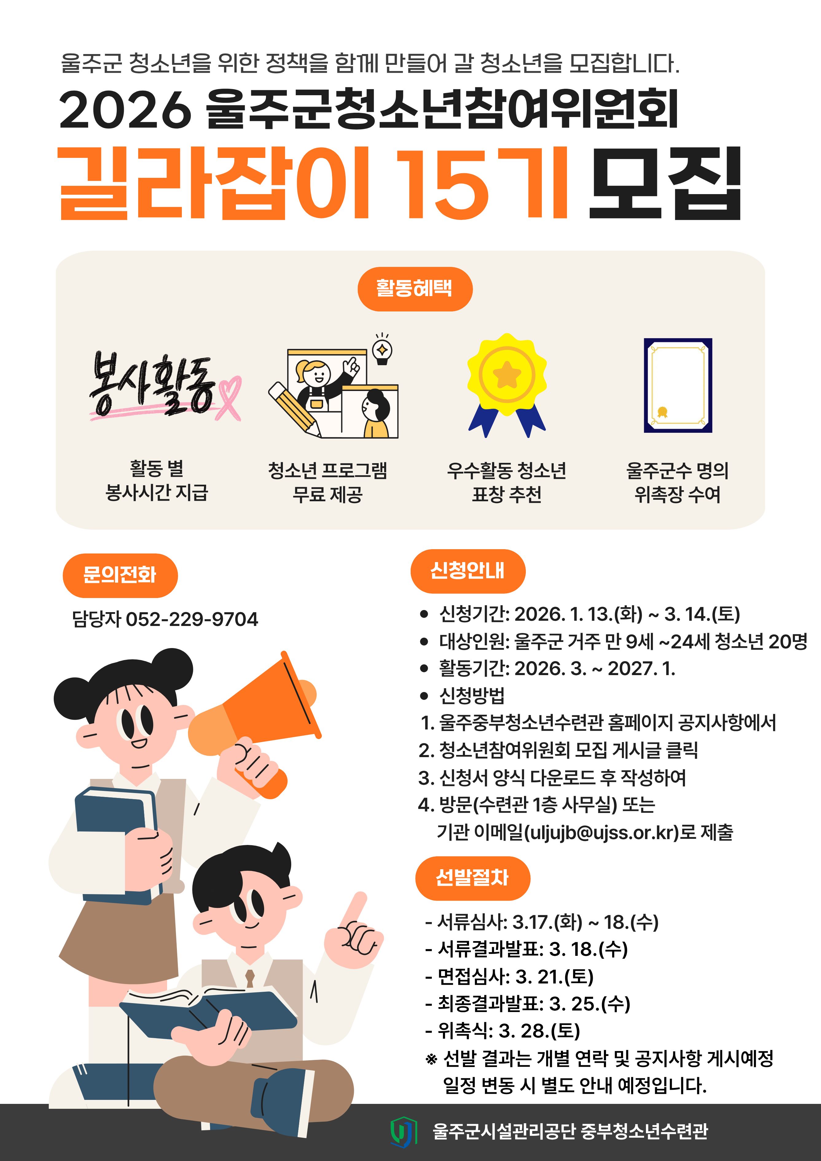 2026년 울주군청소년참여위원회 15기 길라잡이 청소년 위원 모집(~3/14까지)N새글