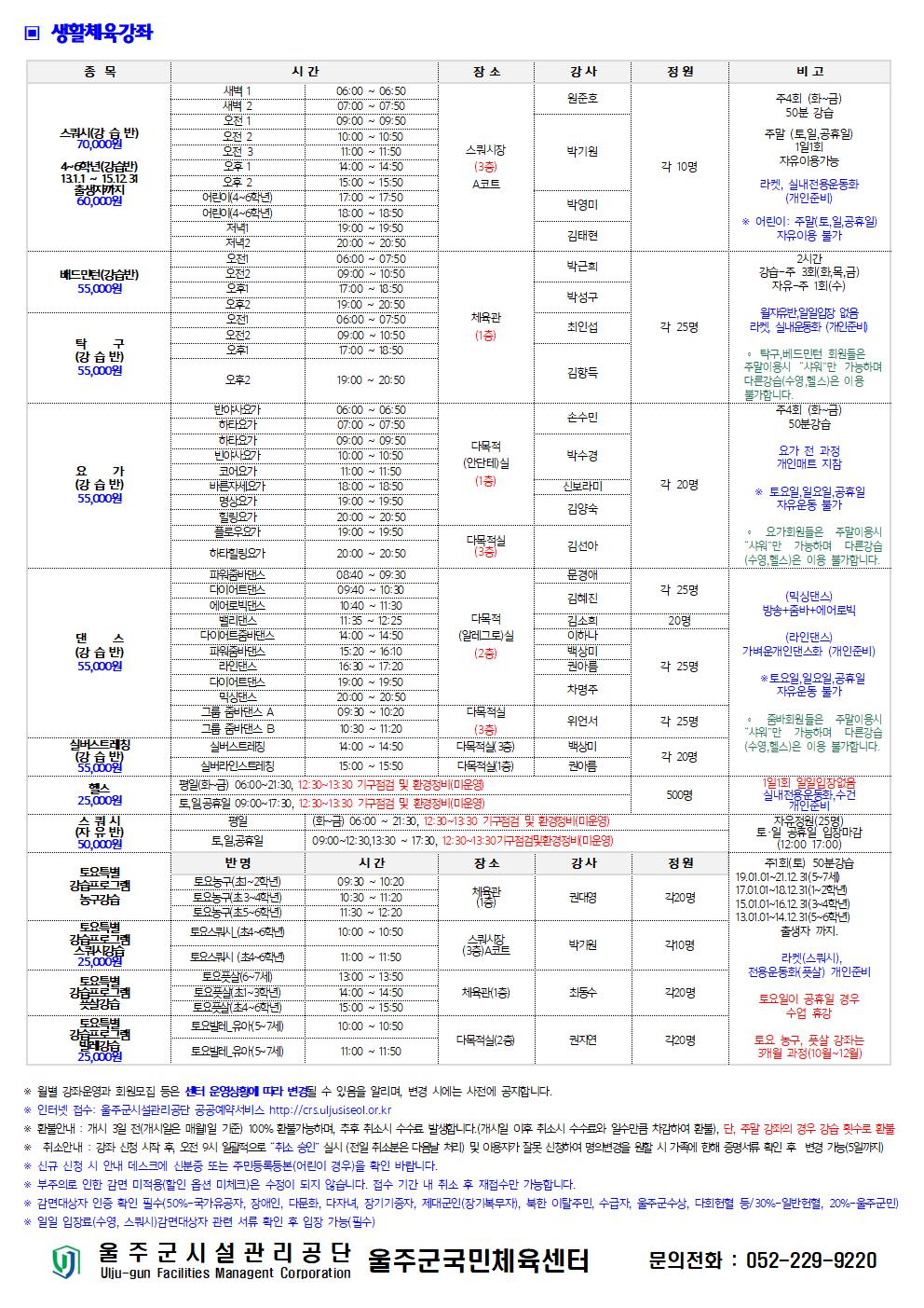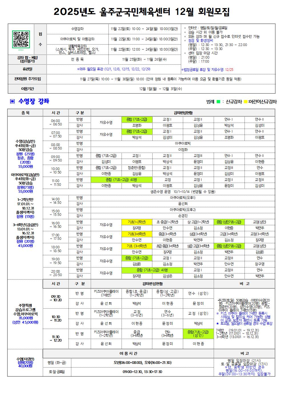 | 제목 | [울주군국민체육센터] 2025년 12월 강좌 회원모집 안내 | ||||
